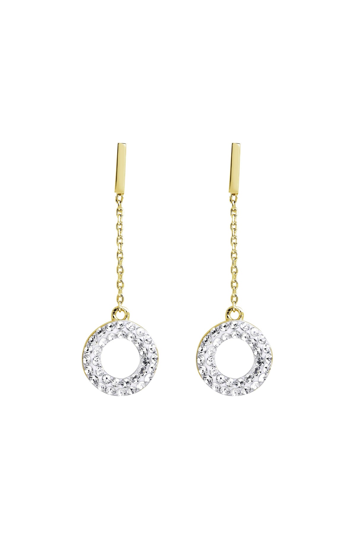 A modern pair of sparkling halo drop earrings elegantly suspended from a bar/chain design. Presented in an Evoke gift box.