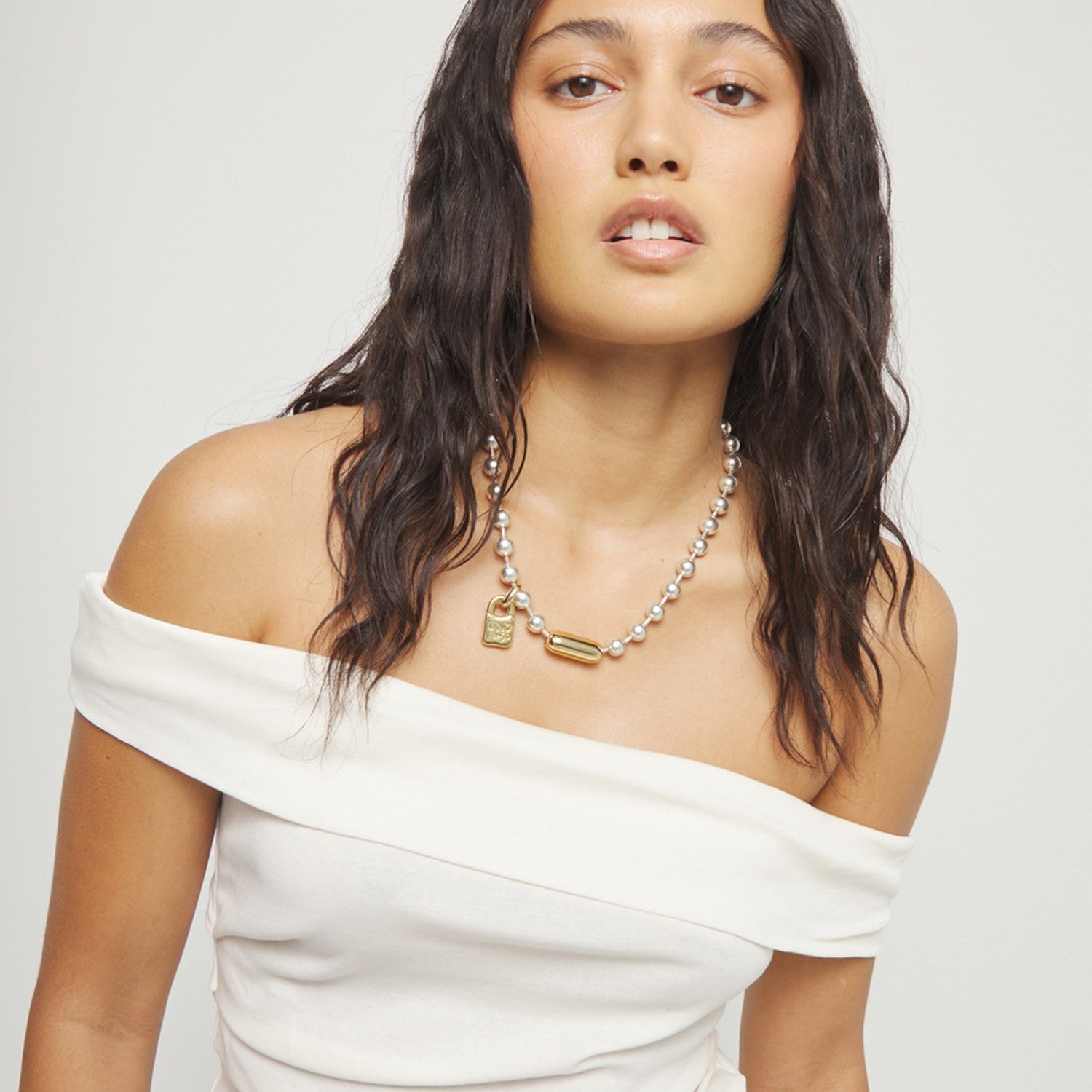 Sterling Silver Plated Ball Clasp And Lock In Gold Plated Necklace COL1390OROMTL crafted with alloy / silver / gold. Key details include Alloy / Silver / Gold, approx. 86.6g.