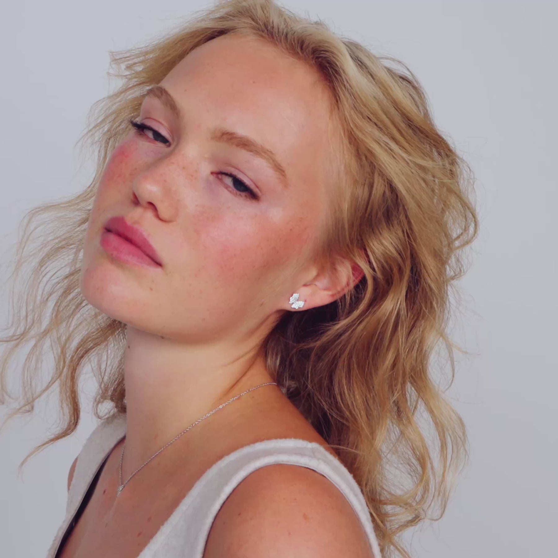 Earrings made of rhodium plated 925 Sterling Silver, a polished surface, and handset with facet cut white zirconia.Earrings measurements: Length 9,15 mm, width 10,15 mm