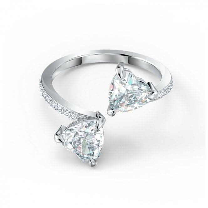 This rhodium-plated Swarovski ring is inspired by the idea of two hearts meeting. It captures the spirit of romance with two heart-shaped, finely cut stones meeting in the middle. The glittering white of the hearts is all the more accentuated by a simple, yet elegant design. Its timeless symbolism makes this Swarovski ring the perfect gift for a special loved one.