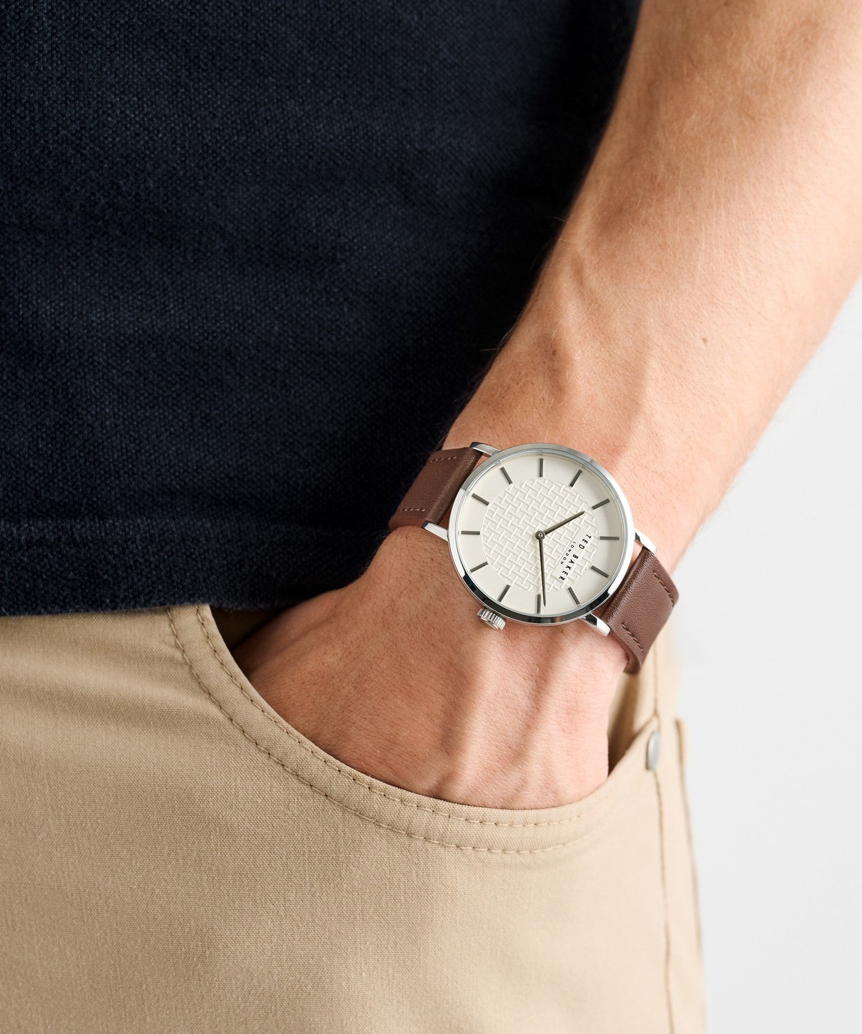 Warm tones and vintage vibes. A cream/beige dial in a 38 mm case, paired with a brown leather strap.