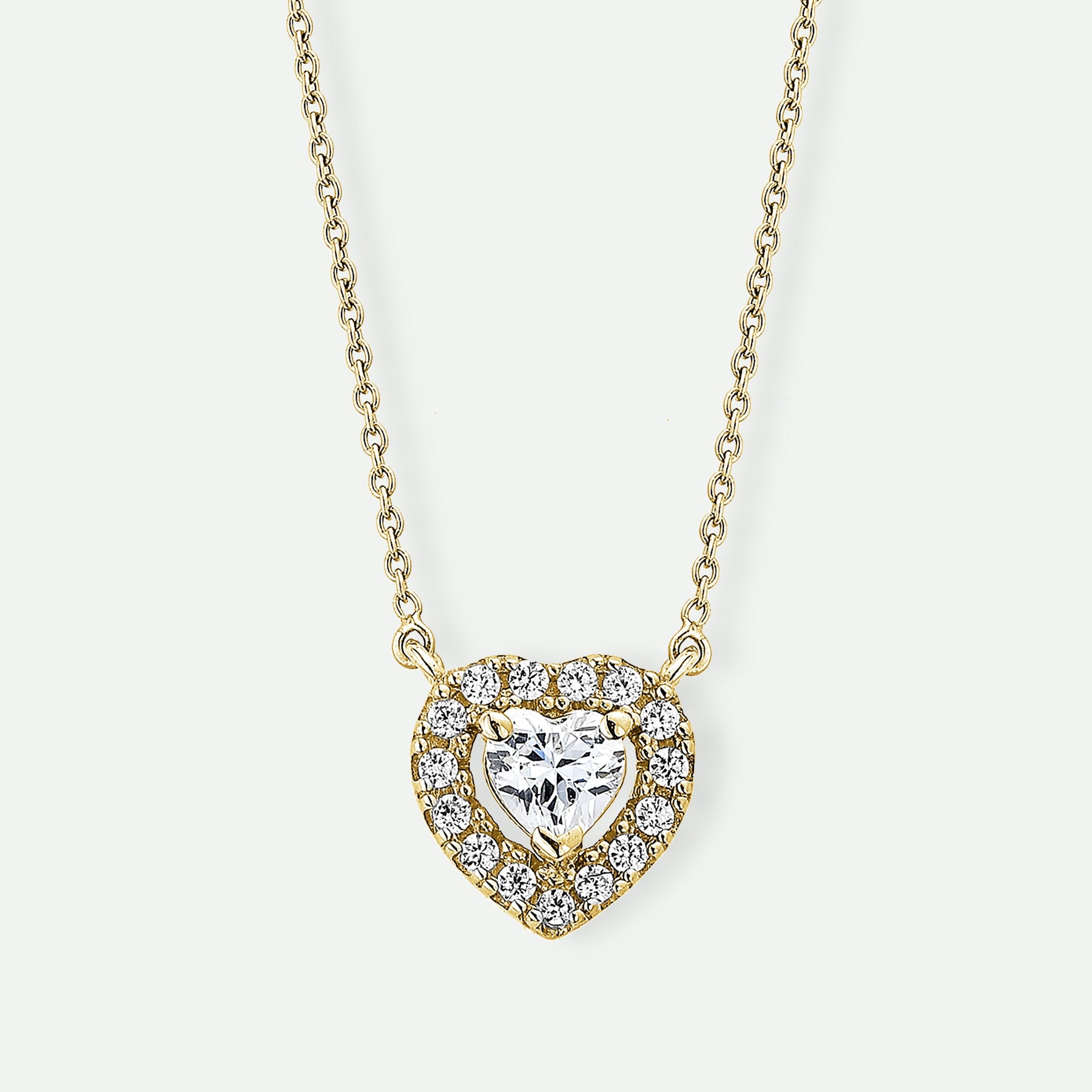 Our Tessa diamond necklace is set with a beautiful heart shape lab grown diamond - perfect for a Valentine's gift. The centre lab grown diamond is framed by a halo of pavé set lab grown diamonds for added sparkle. The Tessa necklace is crafted in 9 carat yellow gold and partnered with an 18 inch chain. This elegant necklace has a total lab grown diamond weight of 0.25ct.