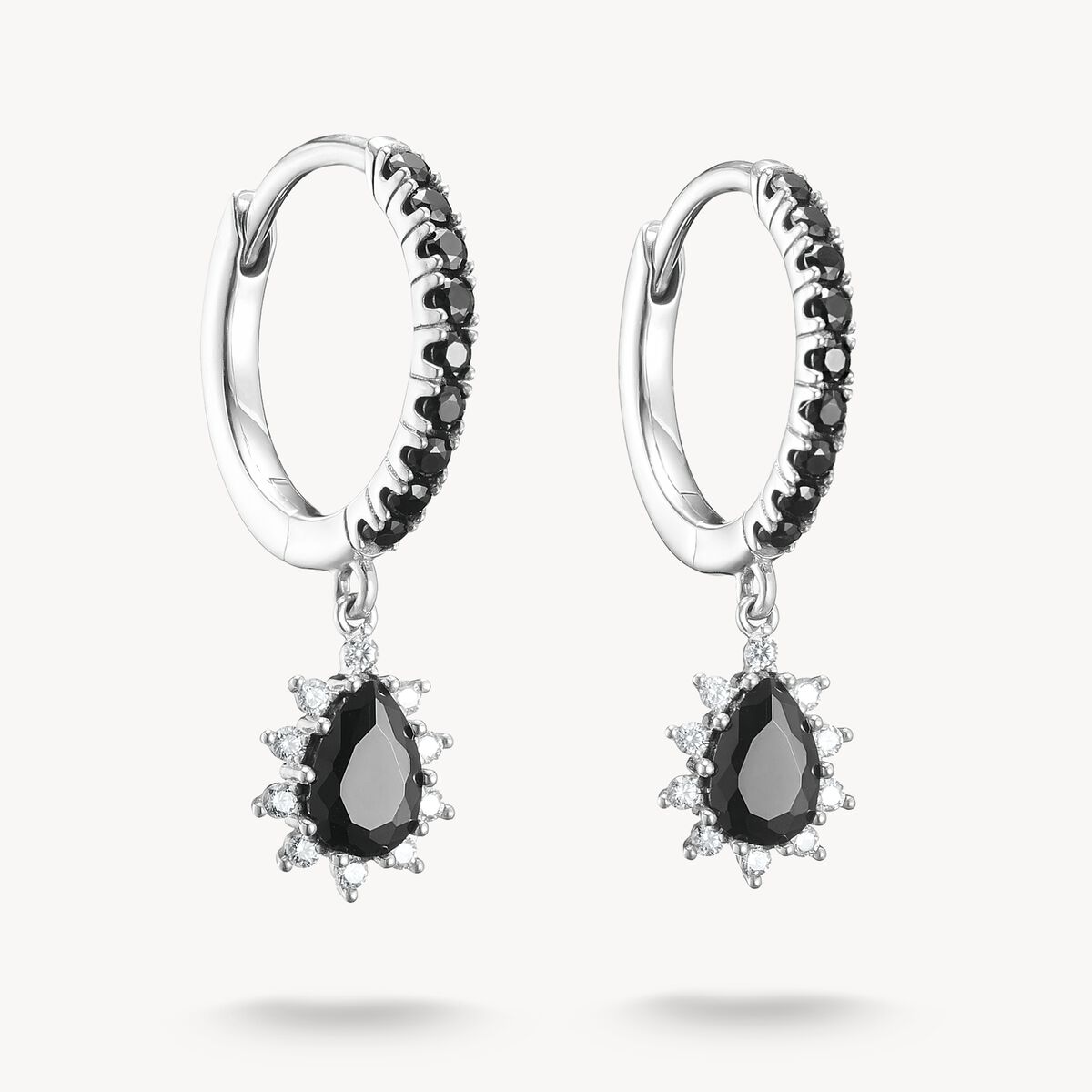 The hoop earrings represent the romantic, dramatic elegance of the True Romance collection. Made from recycled 925 sterling silver with a blackened finish, they are adorned with sparkling black and white zirconia stones. The removable drop pendant recalls Victorian jewellery filled with mystery and passion. A versatile design that makes an expressive statement, whether worn solo or paired with other earrings.