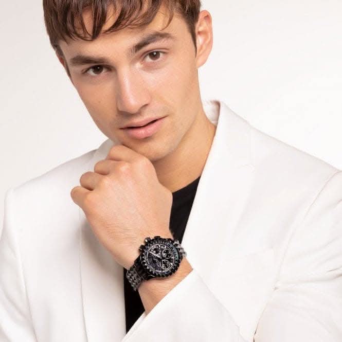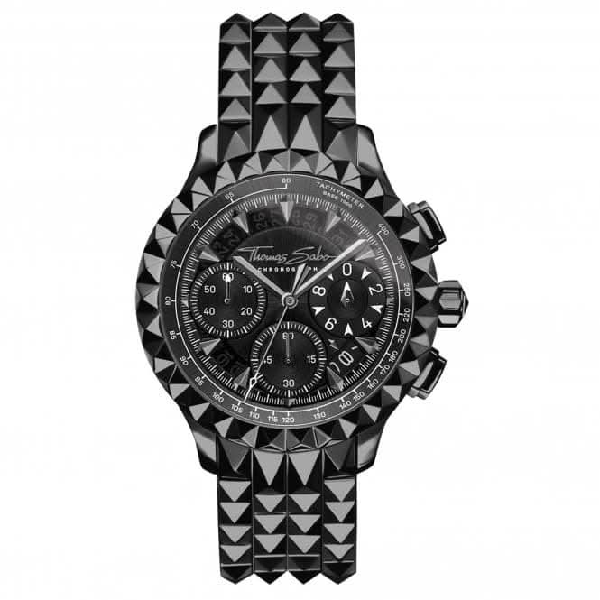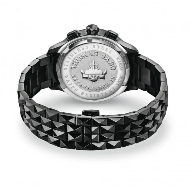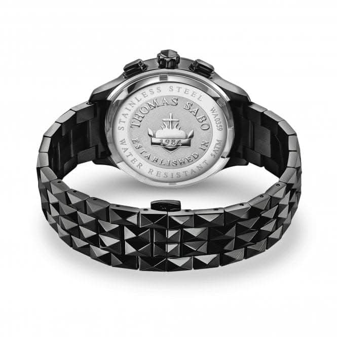 Black watch: Men in particular are impressed by this statement chronograph with its numerous functional and visual features. The THOMAS SABO rebel pyramid look is the central stylistic element on the indices of the dial, bezel, crown and pusher of the case, as well as on the intricately crafted bracelet. The stainless steel of the model has a high quality black ion coating, which makes the colour look particularly intense. The hands in grey metallic stand out from the all-black look of the watch. The functionality of the high quality Miyota quartz movement appeals not only to technology lovers: The counters offer a super-runner function which can measure hundredths of a second. In the tradition of a chronograph, the model also has a tachymeter scale that can be used to measure speed. Further highlight: The numbers on the date display are fully visible thanks to the integrated, slightly transparent acetate glass which acts as a sporty style element. The bracelet can be adapted to the wearer's wrist by removing individual elements.