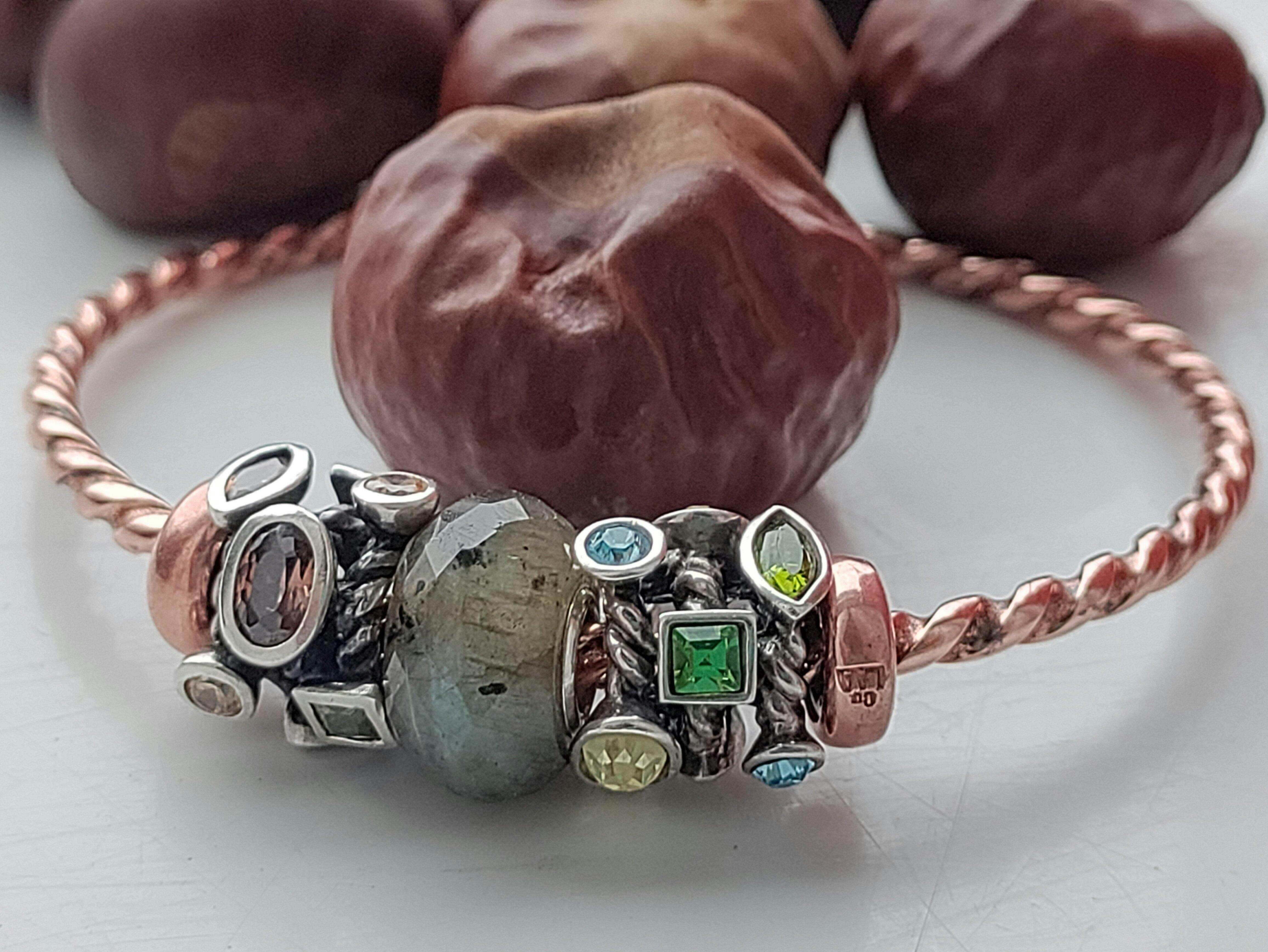 An elegant way to wear your Trollbeads. Use the bangle alone, with your favourite Trollbeads or let several bangles decorate your wrist. Try to mix classic and twisted bangles. The expression is stunning. Use spacers at each end of the beads.