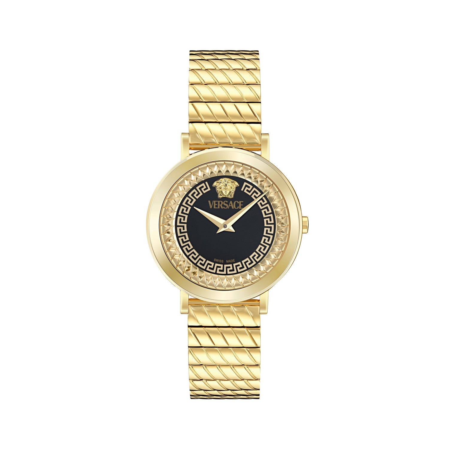 Timeless elegance with a chain-patterned inner ring inspired by Versace accessories, plus Greca accents. The 35 mm Delphinus balances jewelry style with daily wearability.